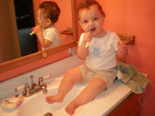A few days ago, Corey called me into the living room and told me he thought Caedmon had said his second word. That word would be...mama? NO! Of course not! Why would we ever want to say mama? His second word...Carl. Carl??!! you say. Where did that come from? Well, have you heard of the books about a Rottweiler dog named Carl? He has a board book about Carl the dog and he LOVES that book! So, when Corey called me out to the living room, he had been "reading" (it's a picture only book) to Caedmon and Caedmon started saying "Car" (not a lot of emphasis on the "r") and Corey had to think a minute, trying to figure out if he was trying to say something. Since then, he continues to say "Car" when he's reading the book and even when he's not. Now, when asked to say mama, I'm met by either silence, a scream, dada, or car. Gee, thanks dude! Love you too! Truly I do!:)